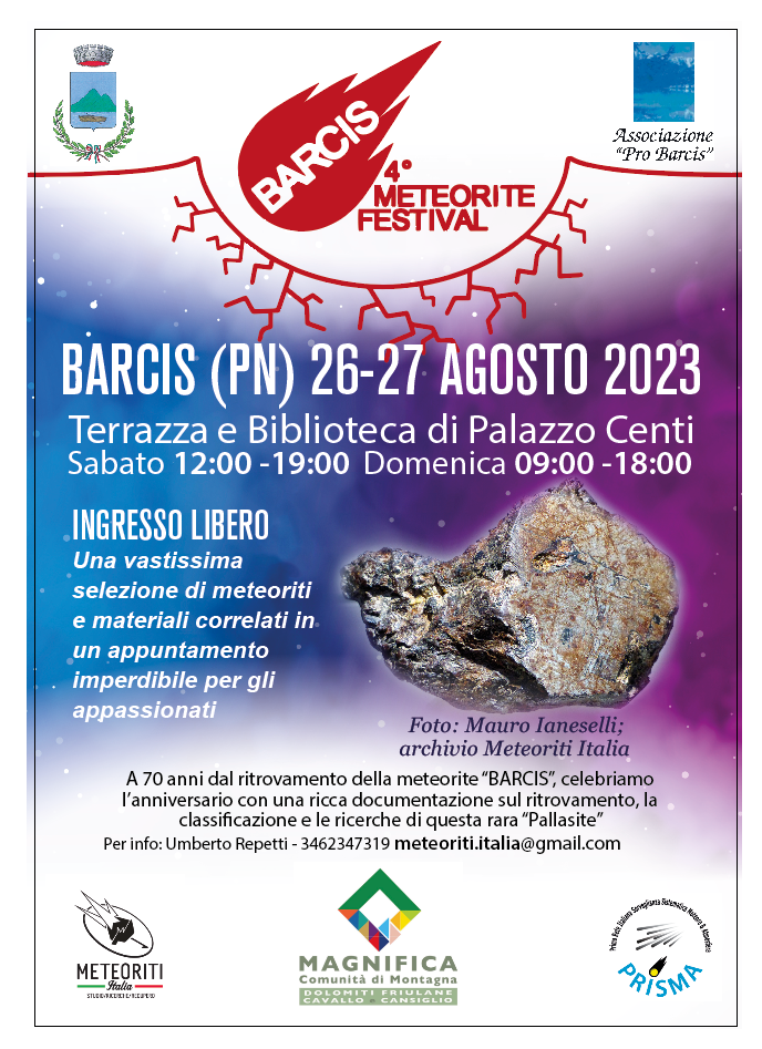 di Meteoriti Italia APS A Barcis (PN) sabato 26 e domenica 27 agosto p.v. si svolgerà il “4°BARCIS Meteorite Festival” dedicato esclusivamente alle meteoriti e articoli correlati. Saranno presenti alcuni dei più importanti collezionisti e “cacciatori di meteoriti” italiani ed una qualificata rappresentanza di “cacciatori di meteoriti” stranieri. Il visitatore che verrà a Barcis oltre a trovare tantissime meteoriti e campioni di rocce terrestri trasformate dall’impatto con enormi meteoriti, avrà l’opportunità di incontrare esperti del settore ed appassionati con i quali confrontarsi in un ambiente cordiale. A differenza delle mostre-mercato di Minerali caratterizzate da vastissime esposizioni di materiali di varia natura, chi vuole procurarsi dei campioni troverà esposte a Barcis solo meteoriti e potrà così confrontare in tranquillità i campioni della tipologia prescelta, valutarne il prezzo e, se necessario, chiedere consigli. La riconosciuta professionalità degli espositori presenti e la grande quantità di materiale extraterrestre esposto sono le garanzie della sicura natura dei campioni e dell’attualità dei prezzi proposti. Meteoriti Italia APS, che è stata fondata per rendere popolari le meteoriti, non è coinvolta con la vendita di campioni però ritiene fondamentale offrire ai vecchi e nuovi appassionati questo momento d’incontro dove poter acquistare le meteoriti desiderate al giusto prezzo ed al riparo da fregature, sempre possibili quando si contrattano campioni rari e difficili da classificare. Il 26 e 27 agosto la Terrazza di Palazzo Centi di Barcis sarà il luogo d’Italia con il più alto numero di meteoriti esposte al pubblico, una occasione imperdibile per tutti quelli che si interessano di meteoriti ed anche per chi, fino ad ora, non si è mai interessato. Meteoriti Italia APS sarà presente con pubblicazioni, stampe, cartoline e francobolli dedicate alle meteoriti. Nel corso della manifestazione, a richiesta, saranno organizzati dei brevi laboratori su come riconoscere una meteorite da un sasso terrestre o da una scoria industriale, e suggerimenti su come cercare e recuperare meteoriti. In questa edizione del “4°Barcis Meteorite Festival” troverete anche: – il Dott. Daniele Gardiol, INAF (Istituto Nazionale Astro Fisica), responsabile del progetto PRISMA che, con uno stand dedicato, illustrerà il progetto e l’ultimo successo della nostra rete nazionale di monitoraggio dei Cieli che dopo Cavezzo ha permesso il ritrovamento di una seconda nuova meteorite italiana. – Una piccola mostra preparata da Meteoriti Italia APS per ricordare i 70 anni dal ritrovamento della meteorite “Barcis” e per illustrare anche le ricerche svolte negli ultimi anni per cercare ulteriori campioni di questa importante pallasite. È un evento, a ingresso libero, pensato per tutti i meteoritici, neofiti ed esperti, per chi vuole avvicinarsi alle meteoriti e anche per chi ha trovato un “sasso strano” che pensa possa essere extraterrestre.