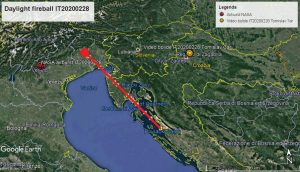 La traiettoria proiettata al suolo di IT20200228 ottenuta usando osservazioni visuali italiane, croate e slovene. Il simbolo rosso a sinistra indica la posizione dell’esplosione rilevata dai satelliti militari statunitensi.