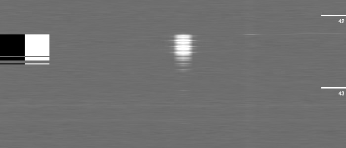 Figura 3 – Immagine dell’eco radar del bolide del 3 giugno 2020 registrata al laboratorio INFN di Legnaro (Padova). In ascissa (asse X), c’è la frequenza, in ordinata (asse Y), il tempo. Cortesia di Stefania Canella INFN-LNL.