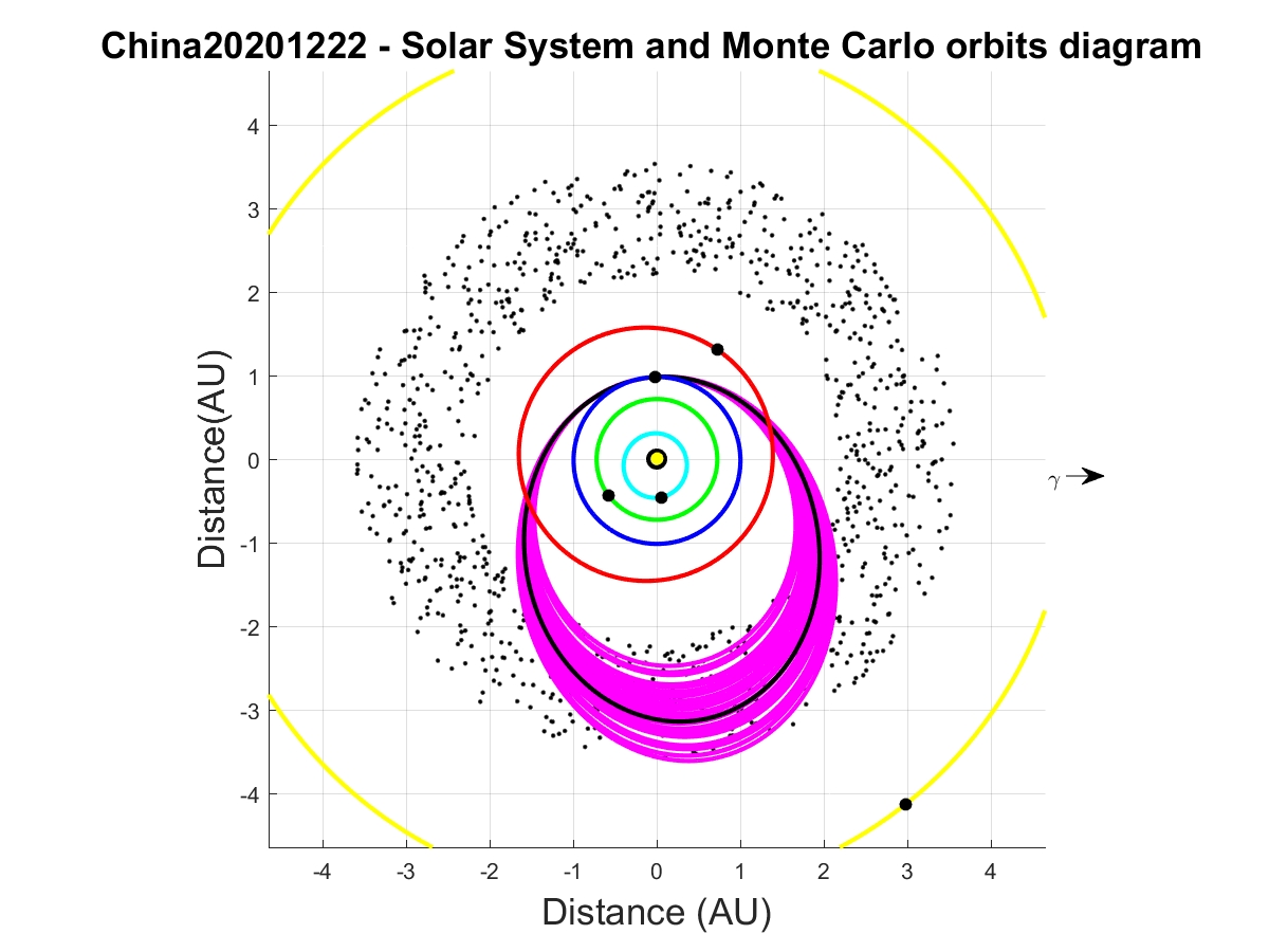 Il radiante apparente del bolide cade alle coordinate equatoriali AR = 00 04 51, Dec = 61° 39′ 11″ (J2000), punto che si trova nella costellazione di Cassiopea, mentre il radiante vero (ossia la direzione di provenienza originaria), cade vicino alla stella alpha di Andromeda. Considerate le grandi dimensioni, la velocità di 13,6 km/s coincide con buona approssimazione con quella che il meteoroide aveva fuori atmosfera e si può utilizzare direttamente per il calcolo dell’orbita eliocentrica. La velocità geocentrica risulta bassa, solo 7,8 km/s, e l’orbita eliocentrica nominale risulta di tipo asteroidale con un semiasse maggiore di 2 UA, un’eccentricità di 0,53 e un’inclinazione di soli 5,9° sul piano dell’Eclittica (Fig. 2).