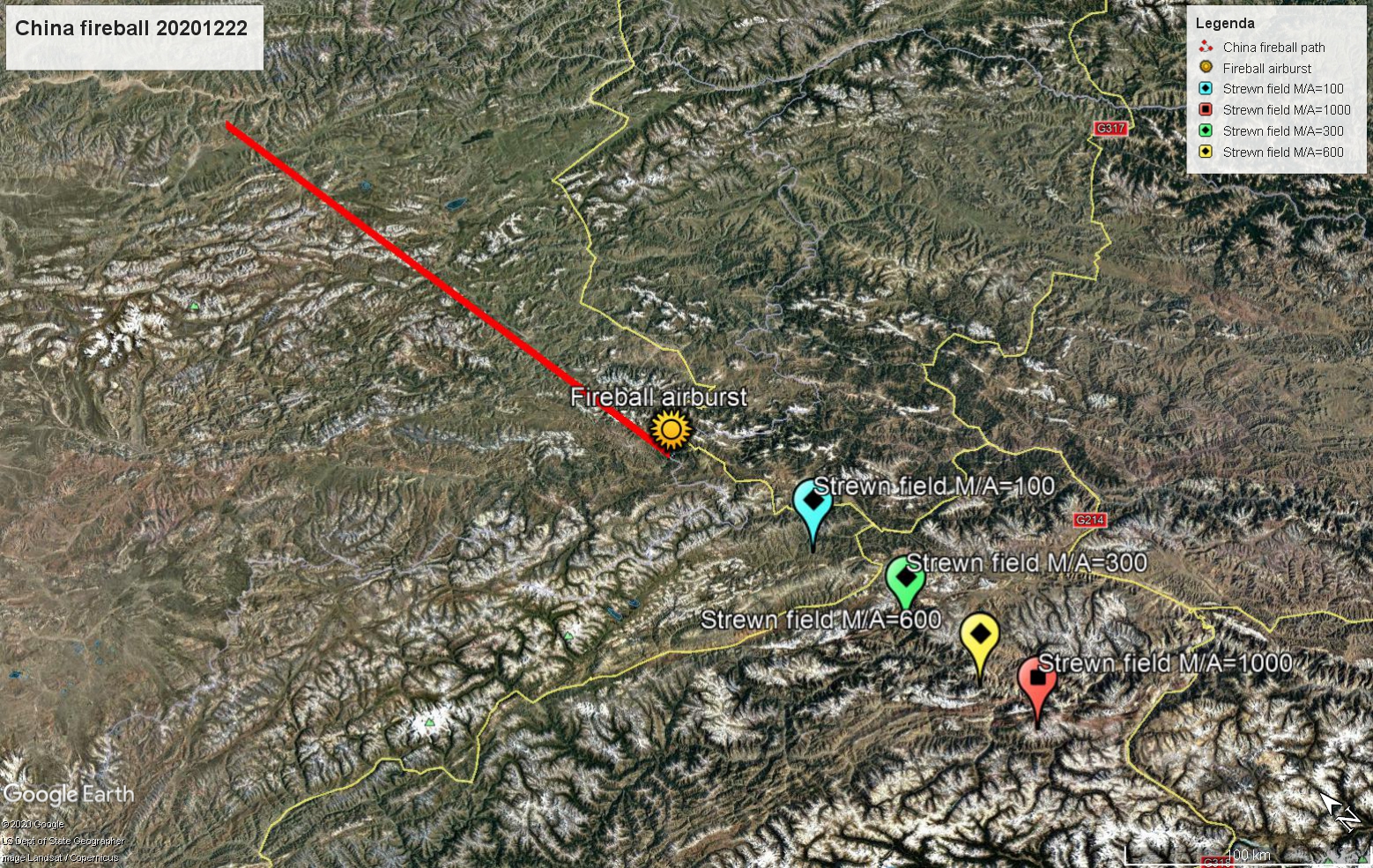 Il 2020 si chiude letteralmente con il “botto”: alle 23:23:33 UT del 22 dicembre 2020 i satelliti militari di sorveglianza USA hanno rilevato un’esplosione in atmosfera alle coordinate +31,9° latitudine N e 96,2° longitudine E. La zona si trova in una sperduta regione montuosa della Cina centro-meridionale (Fig. 1), nella provincia di Qinghai, vicino al villaggio di Wayi Xingrong (3800 m s.l.m.). L’esplosione è stata la fase conclusiva di un brillante bolide che ha attraversato il cielo della regione. Alcuni video che riprendono il bolide sono visibili su YouTube.