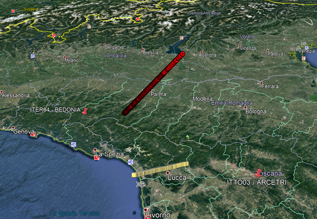 La traiettoria del bolide IT20191209 (in rosso) e la sua proiezione al suolo (in giallo)