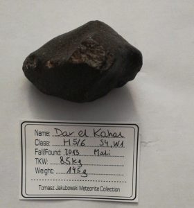 Ecco come appare una tipica meteorite: una pietra con gli spigoli levigati e dal caratteristico colore scuro, per via della crosta di fusione superficiale. All’interno la meteorite è molto più chiara.